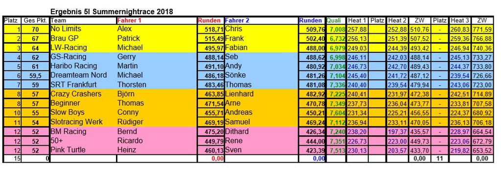 Nach einem spannenden und schönen Renntag stehen die Sieger des diesjährigen 5L-Summernightrace in Neumünster fest. Grückwunsch an "Brau GP", die überlegen gewonnen haben. Dahinter "Roland Racing"