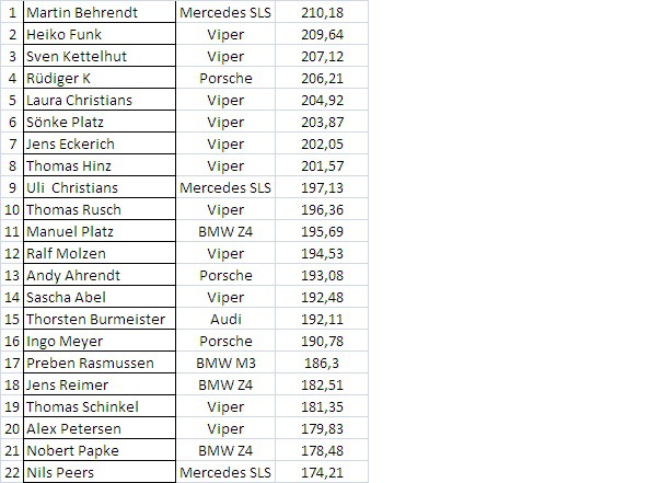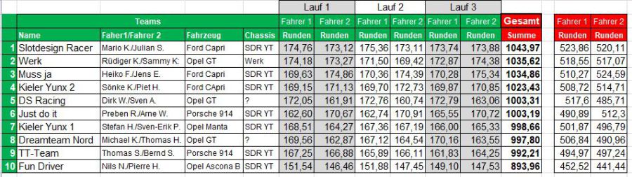 Die Rennen wurden auf 2 Holzbahnen gefahren; nach der Addition beider Einzelergebnisse stand fest: Auf Platz 1 fuhr der Northländer Heiko Funk mit einem Mercedes SLS. Die Plätze 2 und 3 belegten die Flensburger Ralf Leifholz und Sven Kettelhut Glückwunsch.
