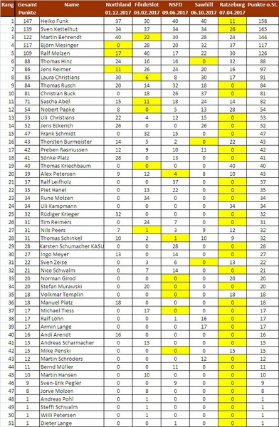 der mit 5 Rennen die wenigsten Punkte erreicht. Überraschung, beide hatten final 31 Punkte und damit geht die Schnecke nach Kiel und NMS.